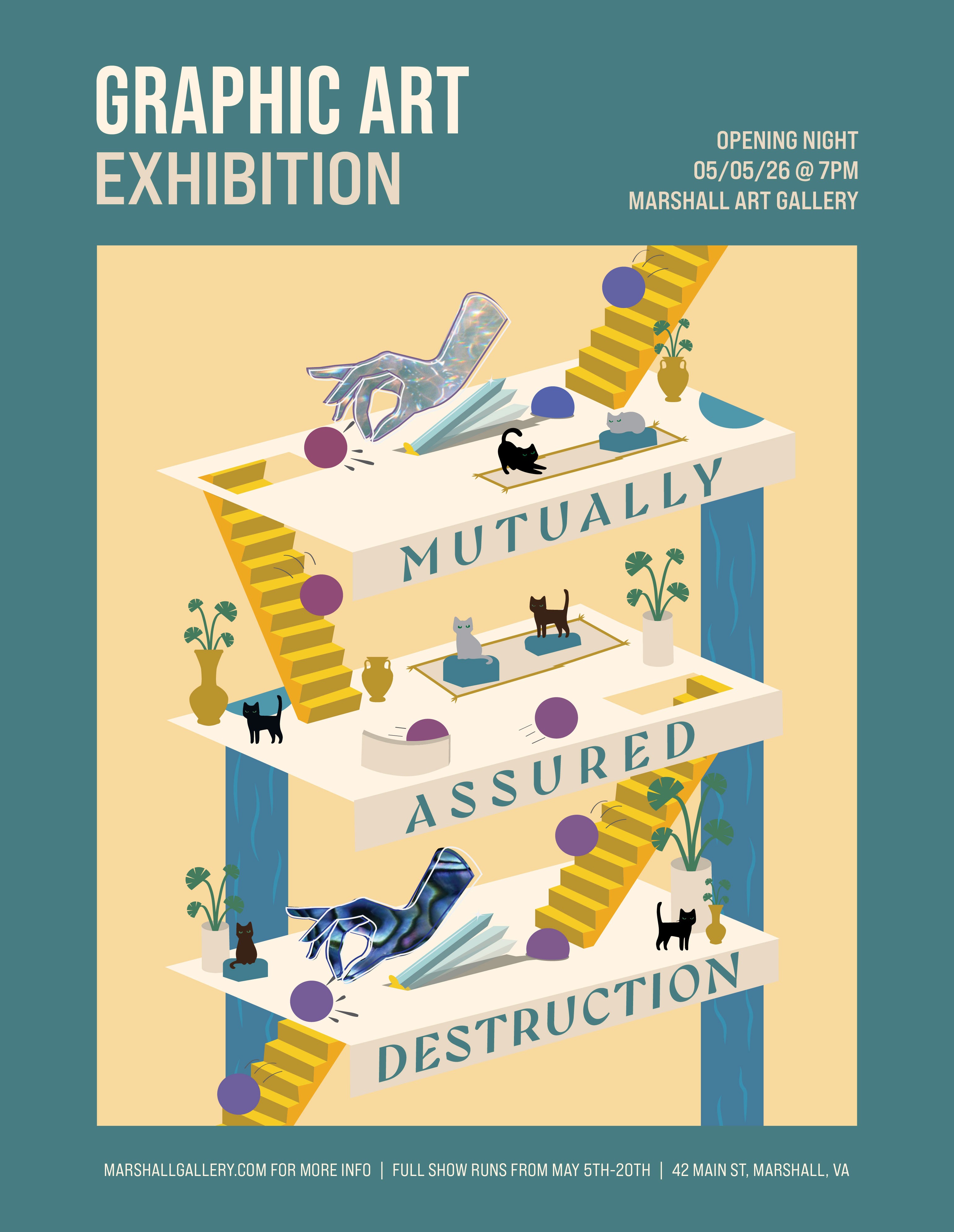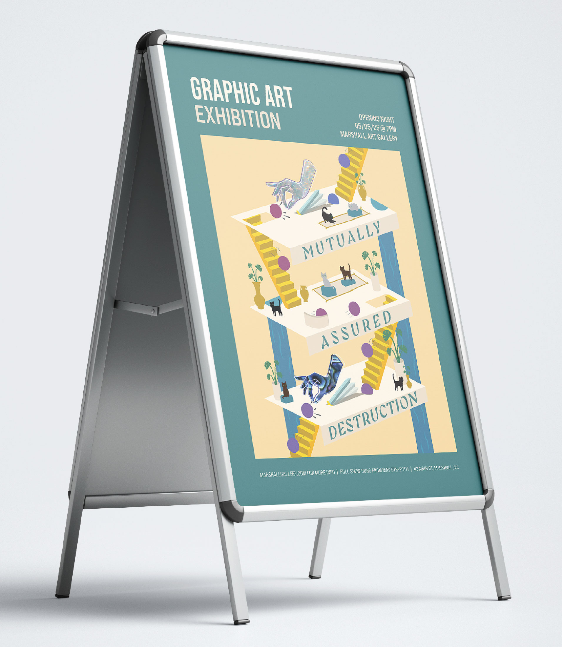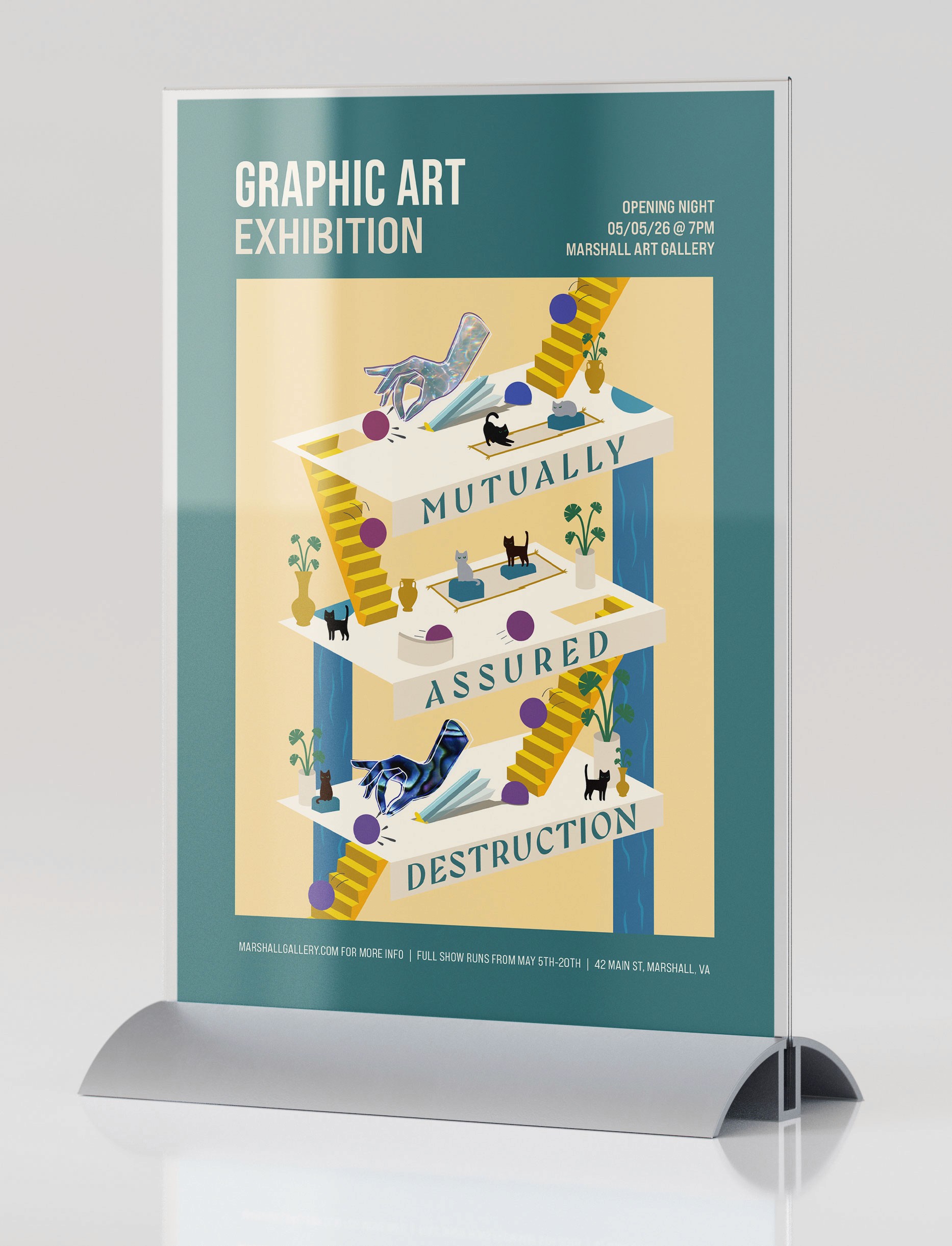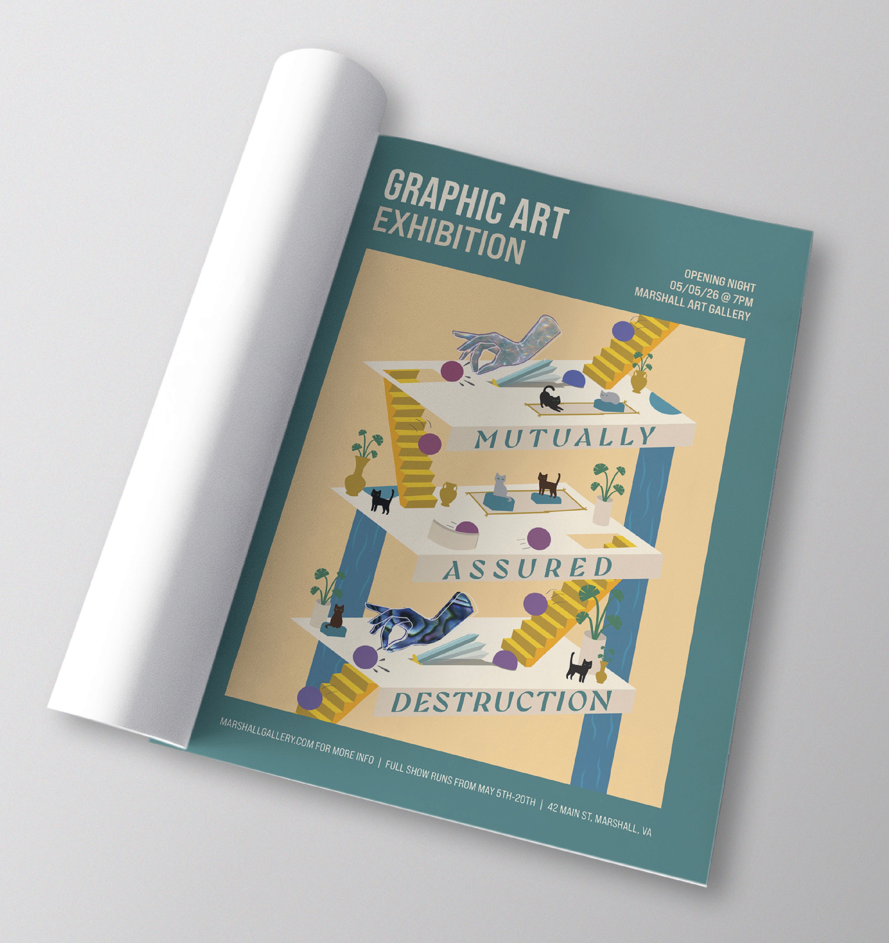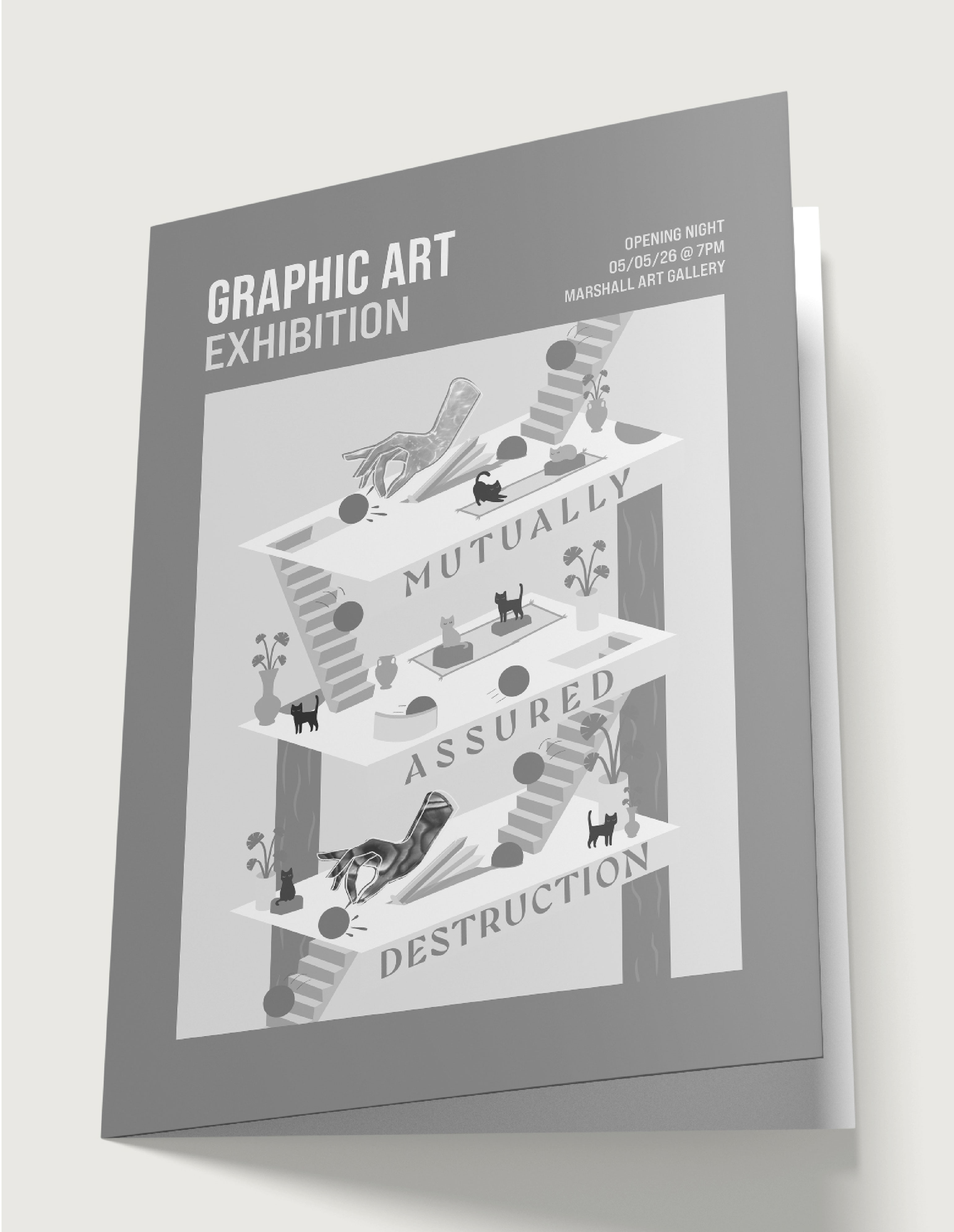 I designed the promotional materials for a local graphic art exhibition, centered around a main poster concept that had to scale across multiple print formats. The project included illustrating the artwork that would be displayed on all materials, designing the main poster as well as a smaller flyer and event booklet. This project had a strong focus on layout, hierarchy, and typography.