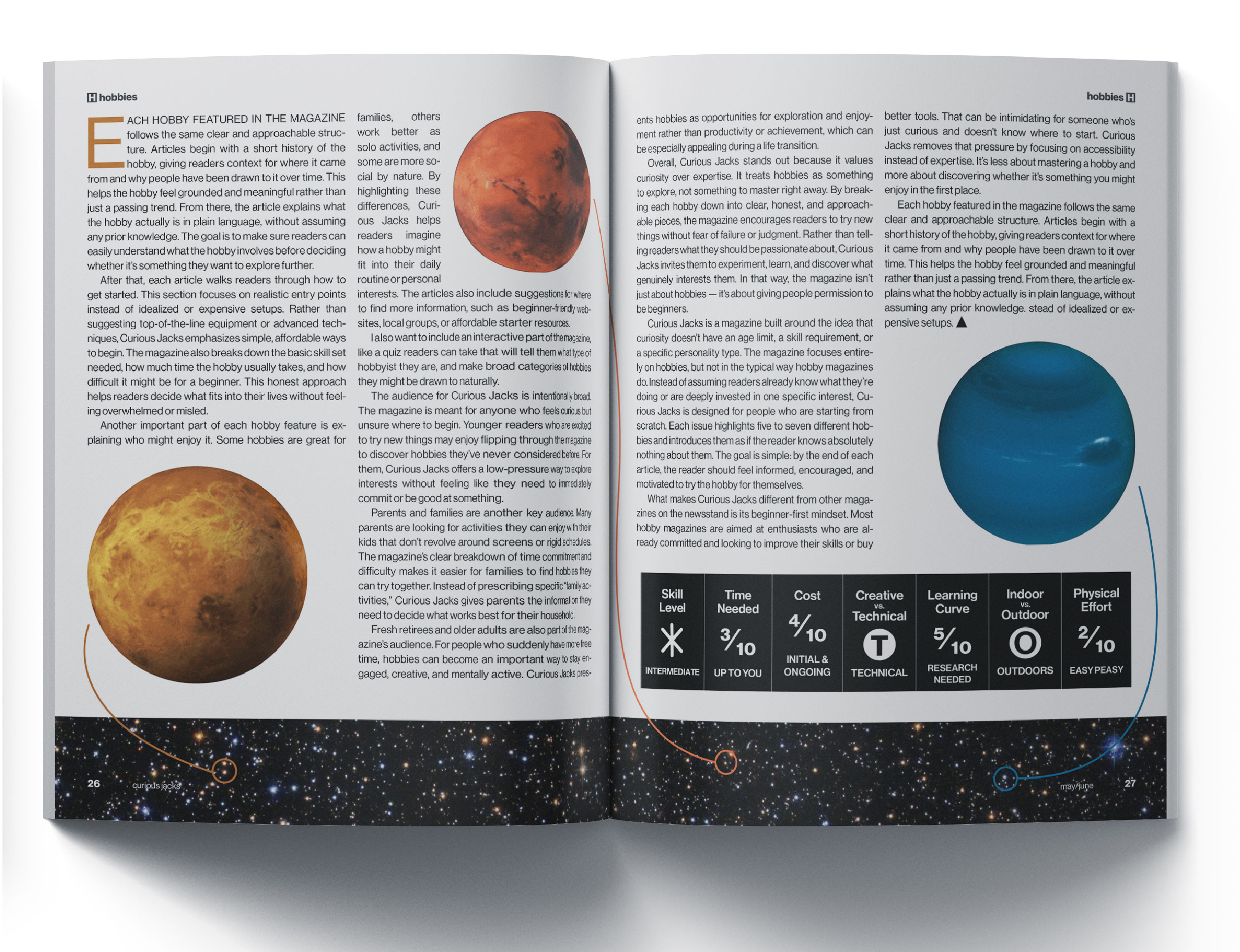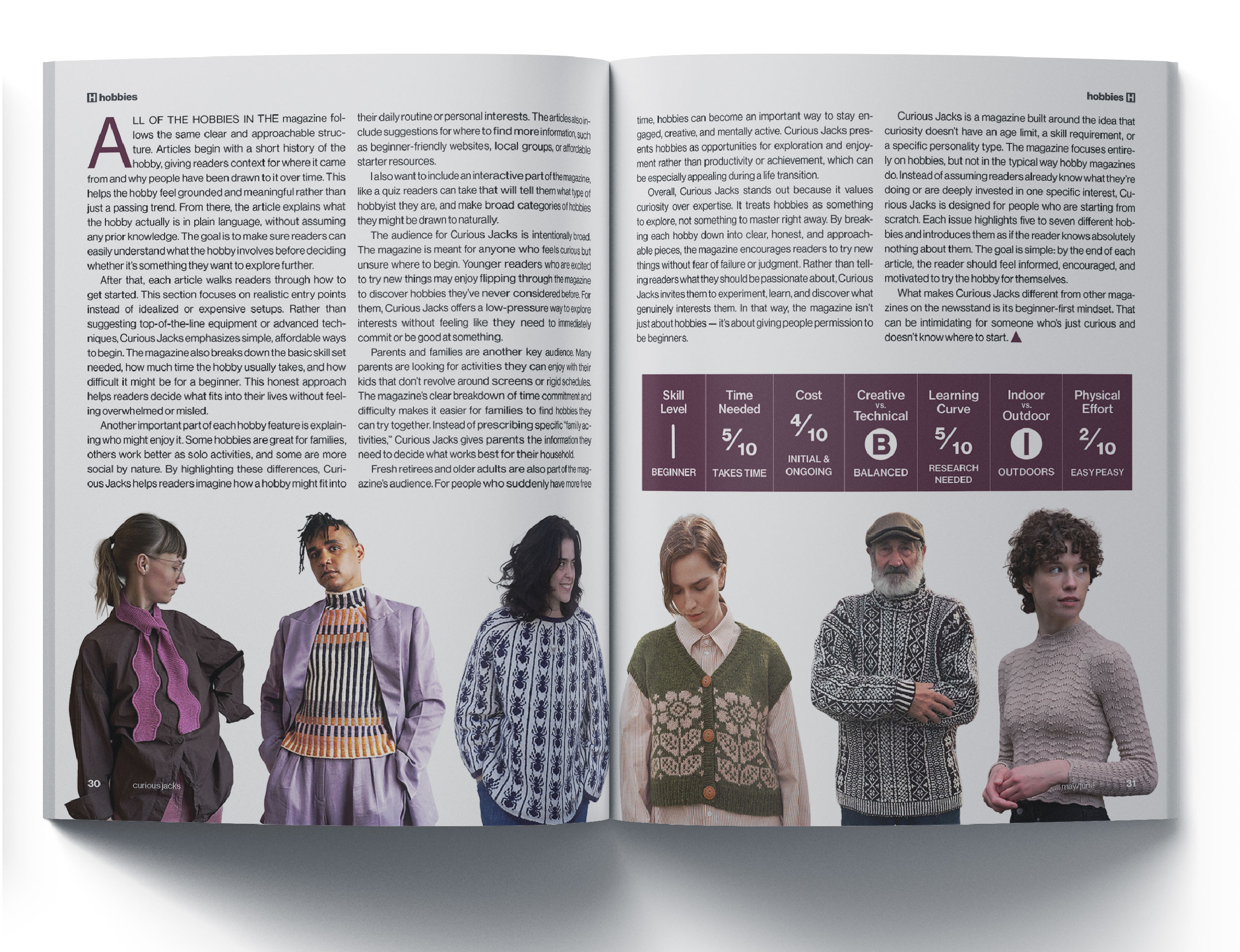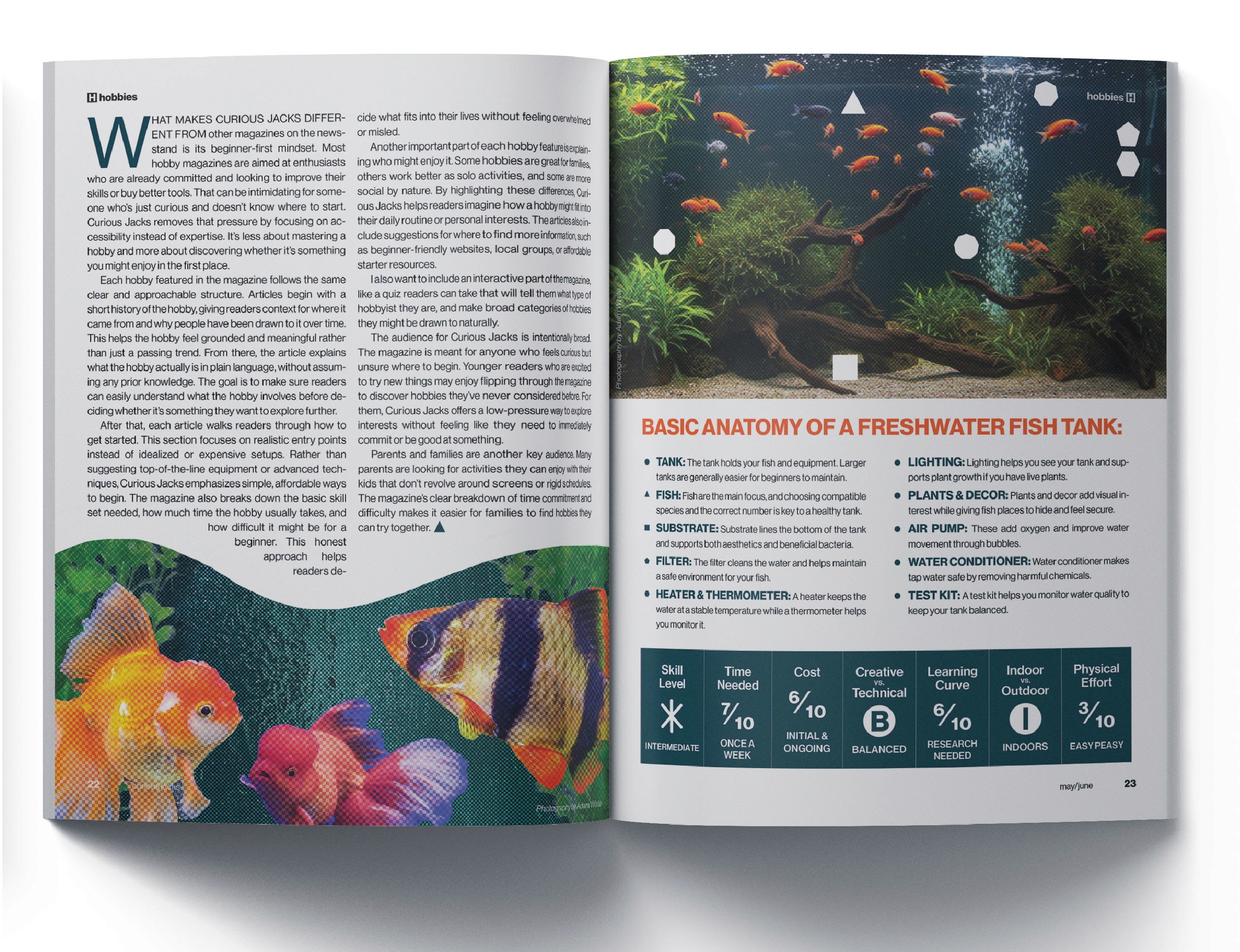 I conceptualized and designed Curious Jacks, a hobby magazine aimed at beginners, developing both the publication’s core idea and its visual identity. I created the full editorial design system, including typography, grid structure, layout templates, and cover design to ensure consistency across varied content. The project culminates in a full-length, full-scale mockup produced for both print and iPad formats, demonstrating cohesive design across multiple page types and platforms.