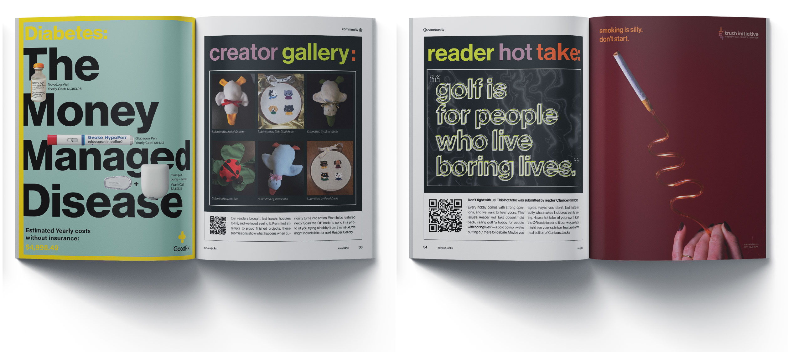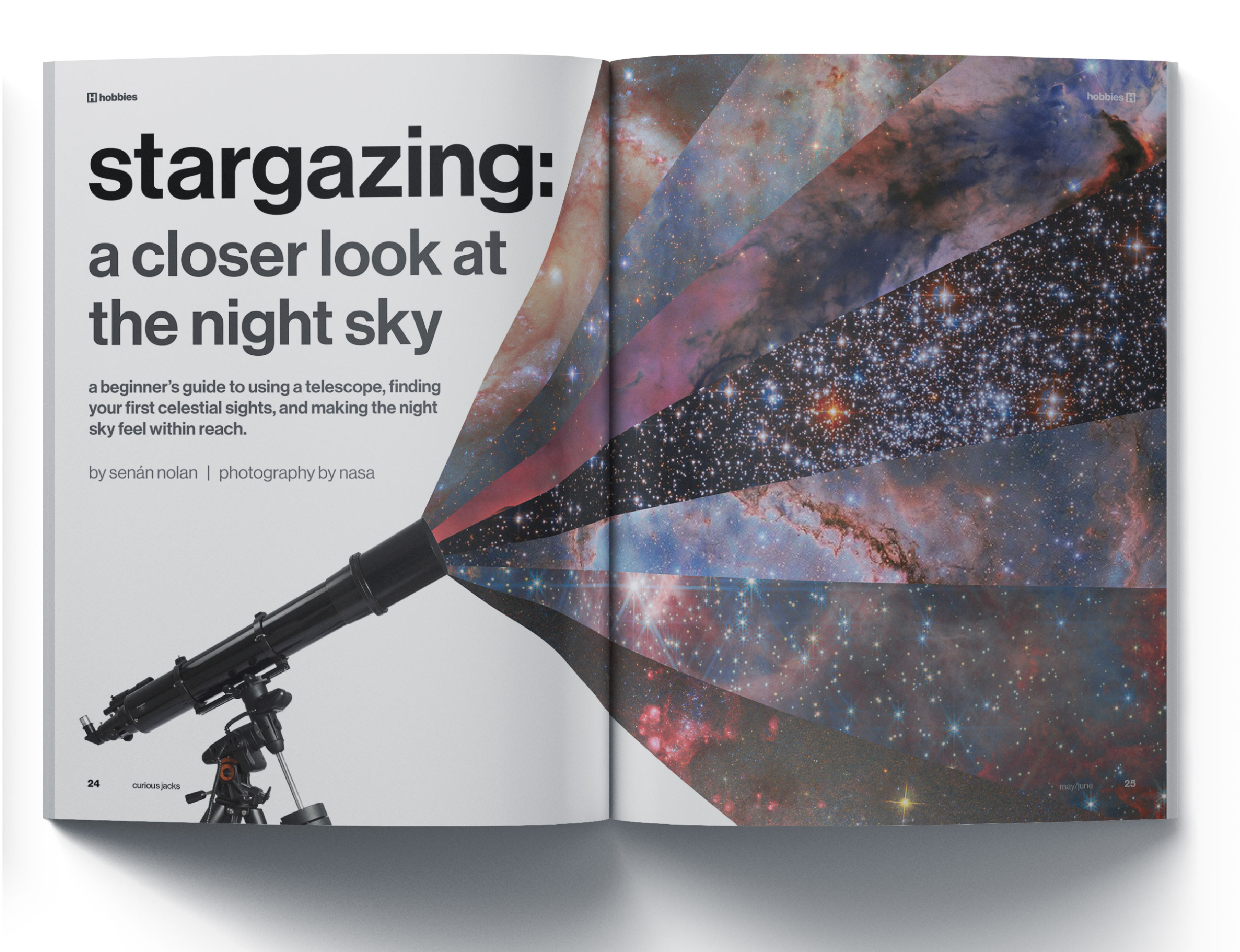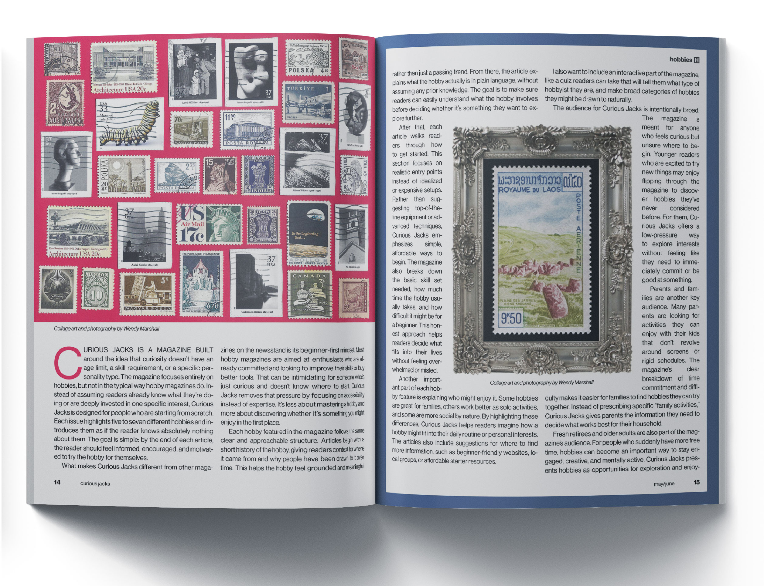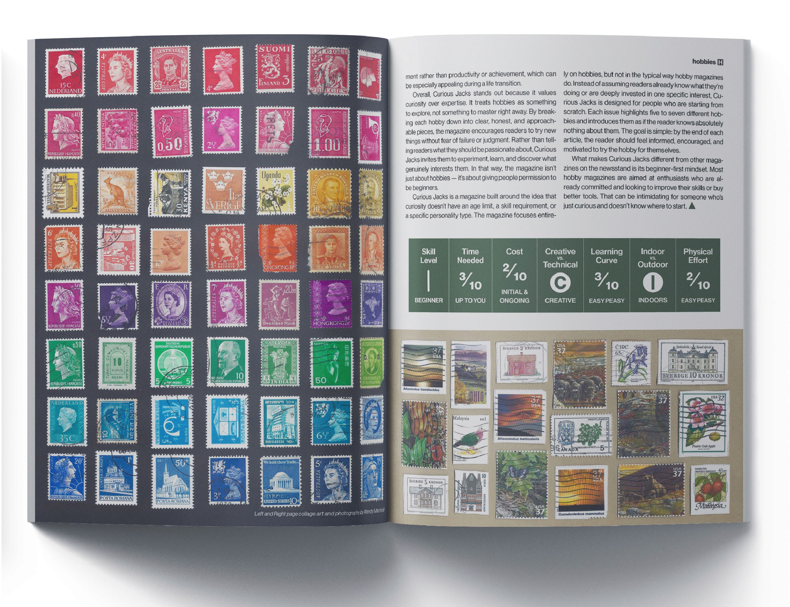 I conceptualized and designed Curious Jacks, a hobby magazine aimed at beginners, developing both the publication’s core idea and its visual identity. I created the full editorial design system, including typography, grid structure, layout templates, and cover design to ensure consistency across varied content. The project culminates in a full-length, full-scale mockup produced for both print and iPad formats, demonstrating cohesive design across multiple page types and platforms.