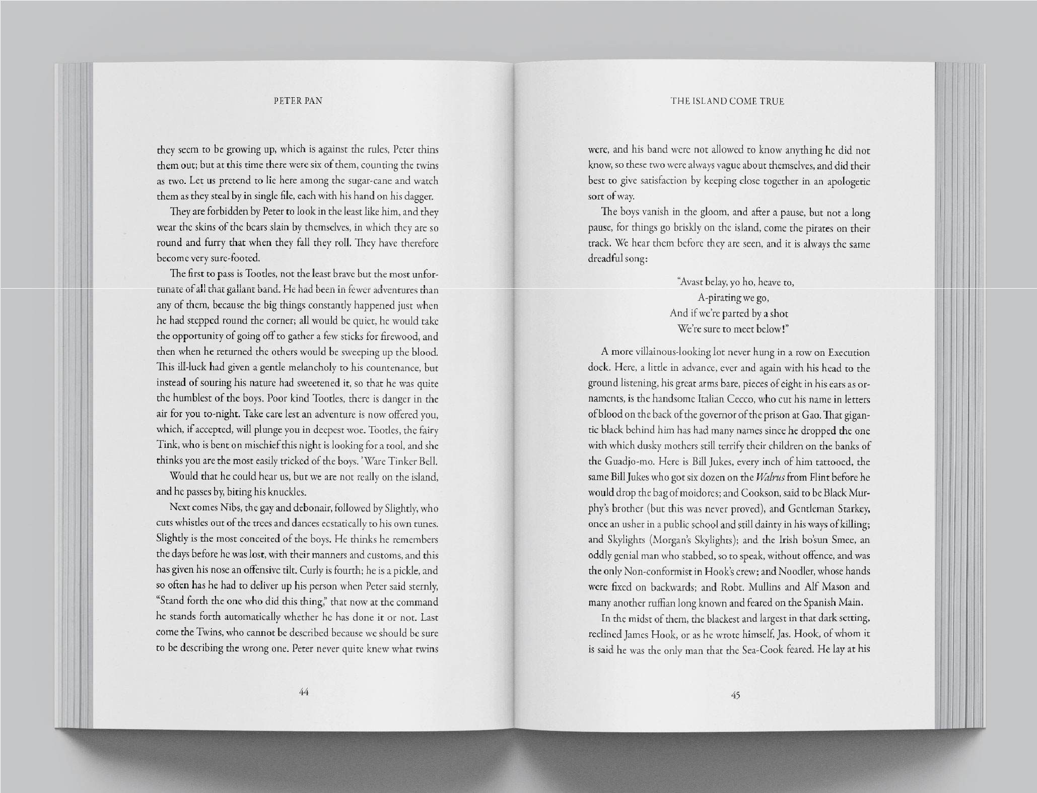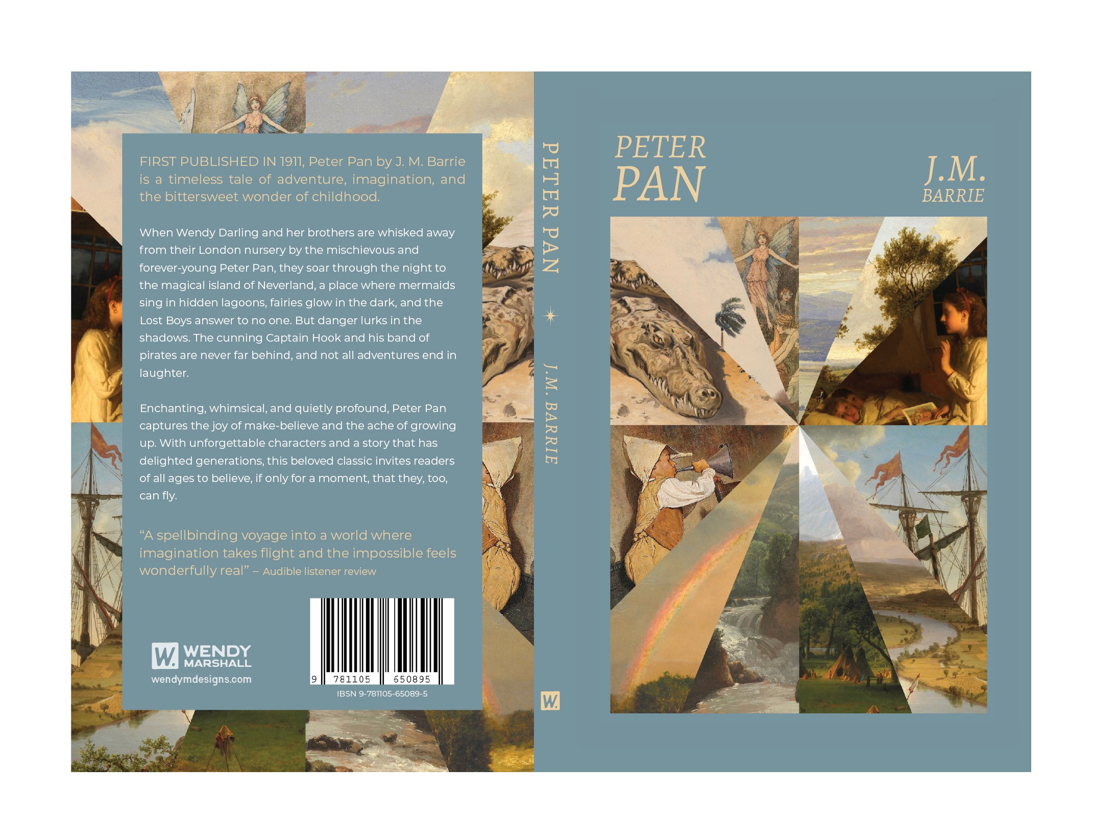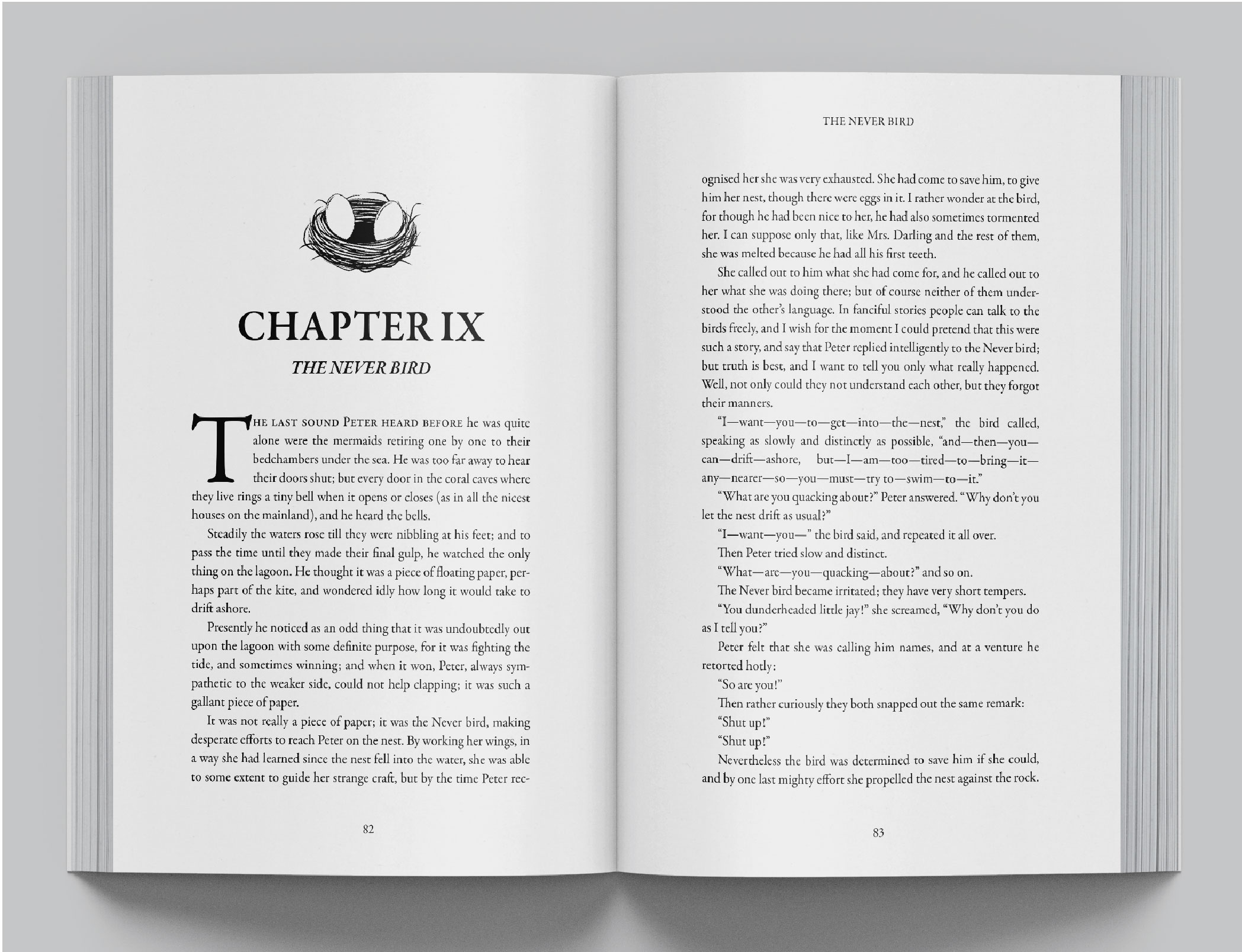 I designed a special edition of Peter Pan, including the front cover, back cover, spine, and complete interior layout. The project also features original chapter-opening illustrations and required a strong focus on typography, page and book layout, and cohesive visual storytelling.