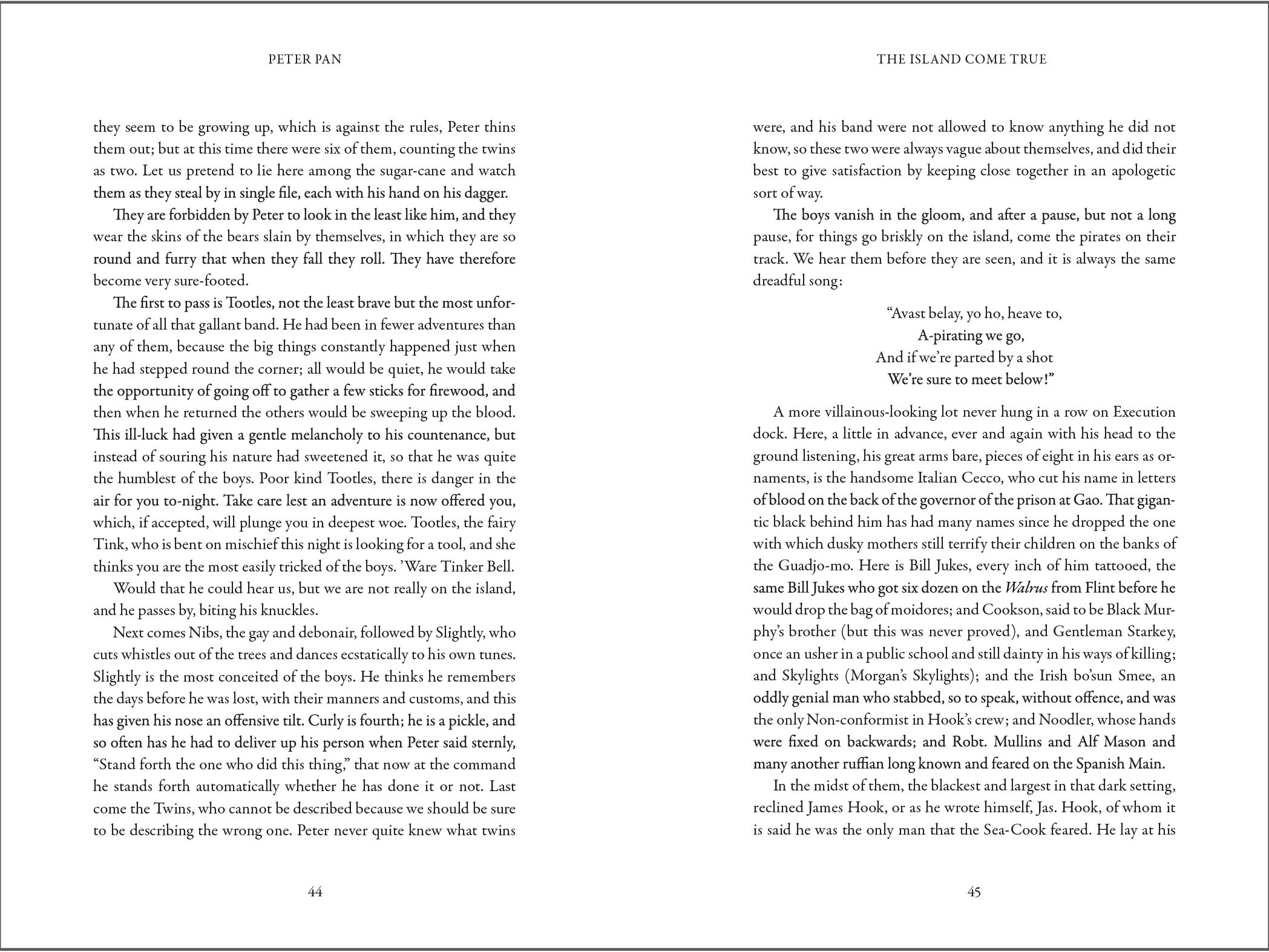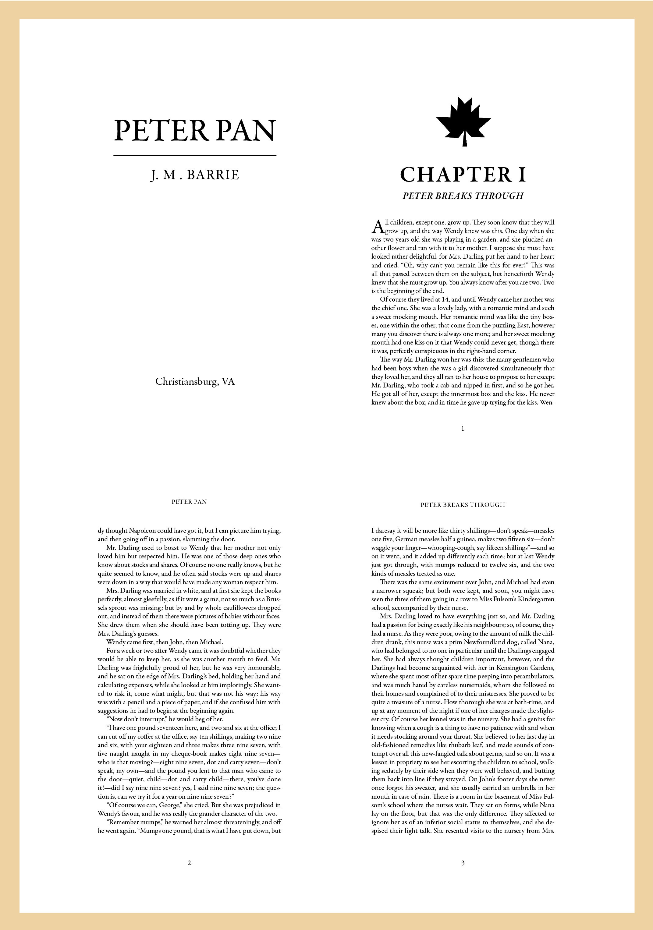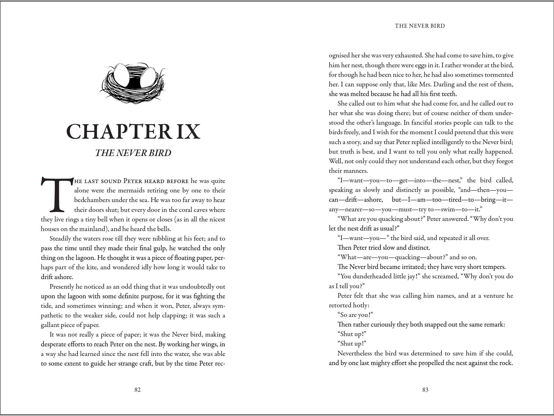 I designed a special edition of Peter Pan, including the front cover, back cover, spine, and complete interior layout. The project also features original chapter-opening illustrations and required a strong focus on typography, page and book layout, and cohesive visual storytelling.