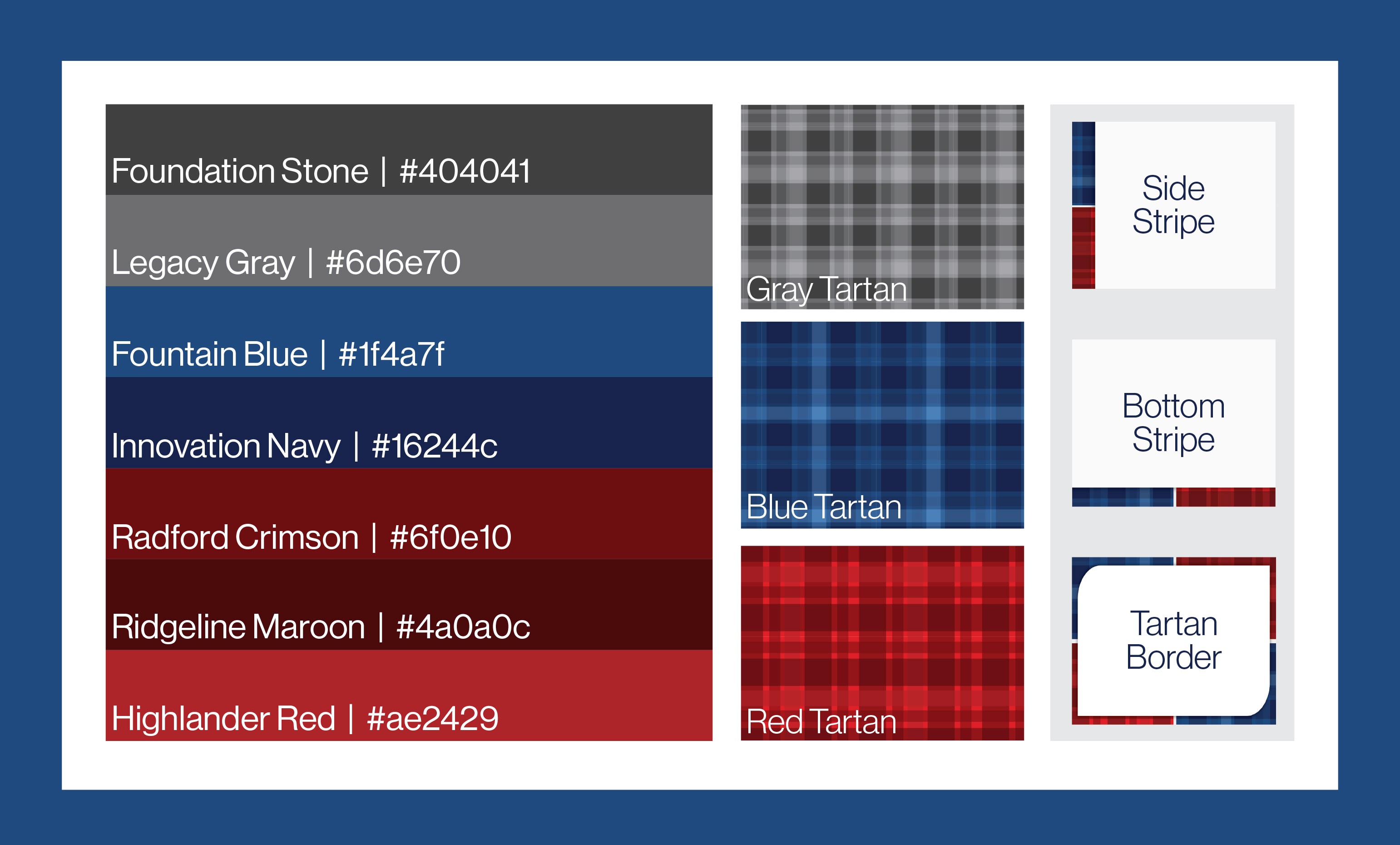 The type also shows both tradition and progress. “Radford University” uses the official serif font to keep a clear link to the school. “Foundation” uses a simple, modern sans serif font for contrast and to suggest forward thinking. Together, the two styles honor the University’s history while showing the Foundation as its own strong, approachable identity.