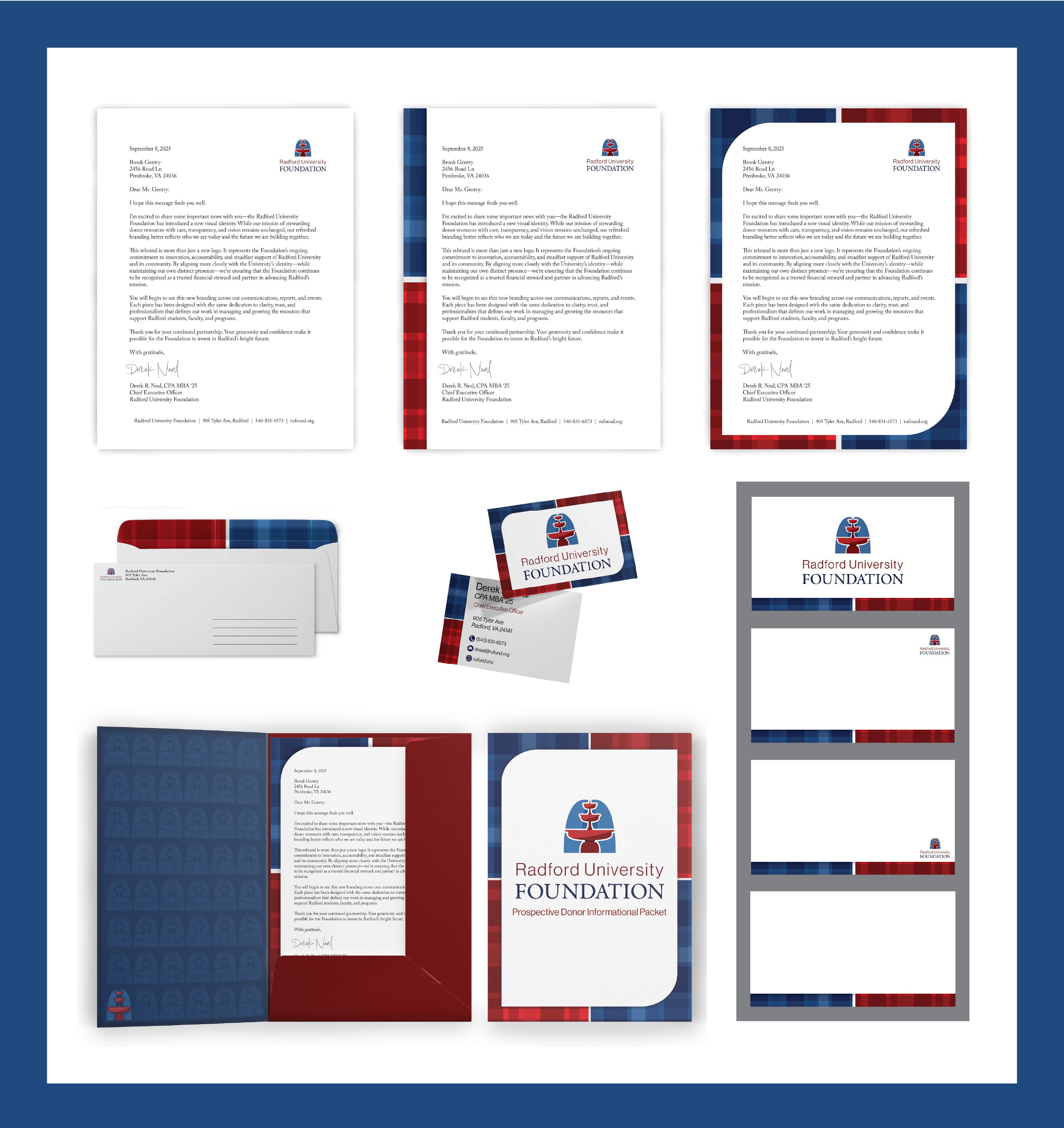 I developed a refreshed visual identity for the Radford University Foundation, which focused on creating a modern, trustworthy brand that resonates with its primary audience of donors while maintaining a clear connection to Radford University. The project included a comprehensive logo system, detailed brand guidelines, and supporting materials to ensure the Foundation can present a consistent, professional identity across all communications and platforms.
