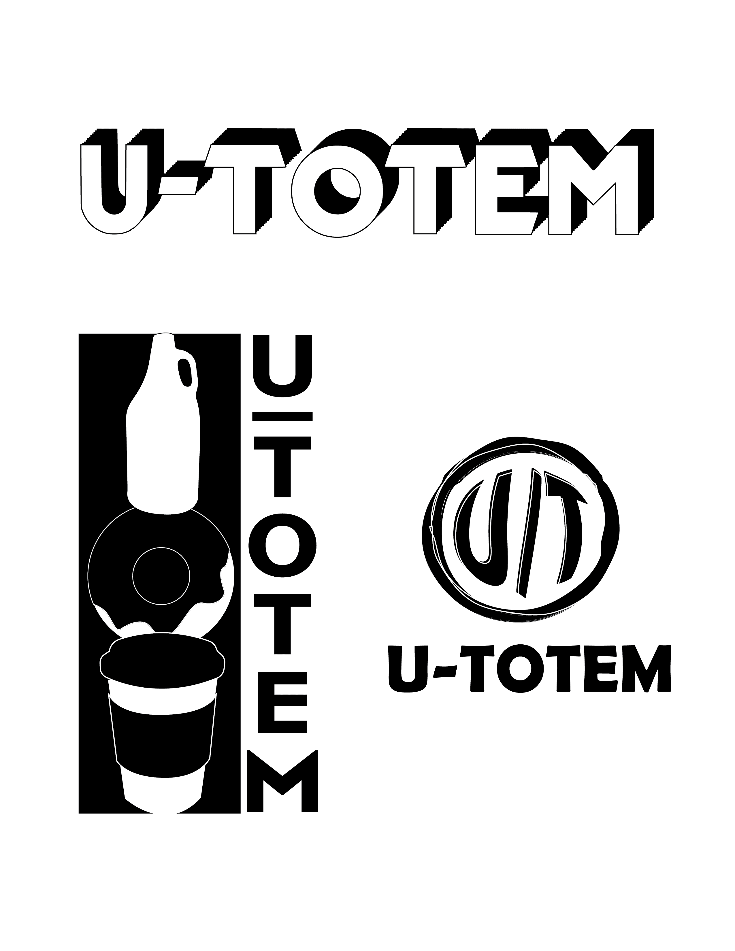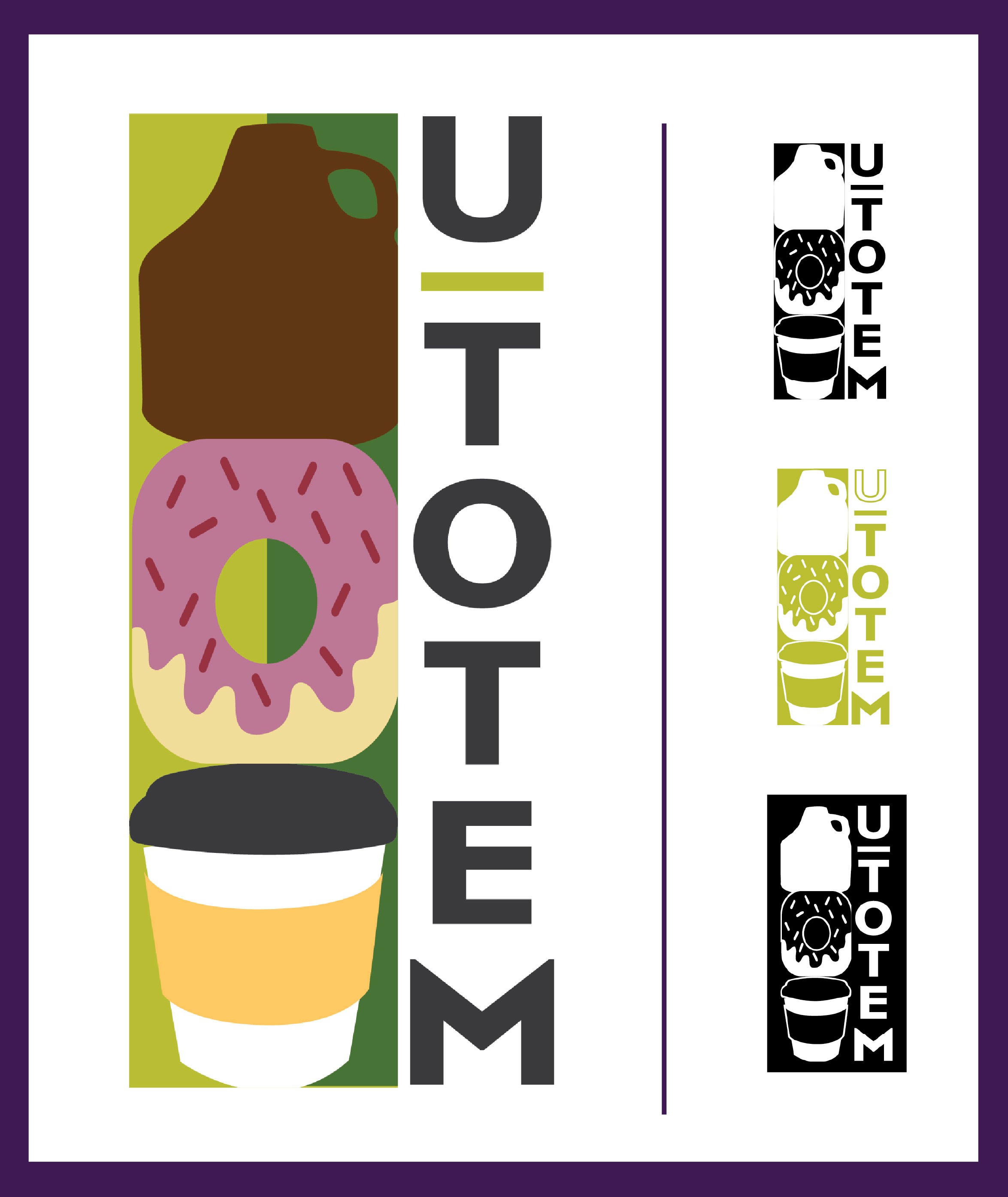 Logo option 2: This logo shows off what one can expect when you shop at an U-Totem. The logo icon features a to-go coffee cup, a donut, and a growler in a shape that’s reminiscent of a totem pole. The two toned green background was chosen to represent the freshness that U-Totem offers to their shoppers. The typeface was chosen for its clean, upscale feel, and was turned upwards to mimic the shape of the main logo icon. Using these visuals clearly differentiates U-Totem from it’s competitors while indicating to shoppers that they have fresh, unique offerings.