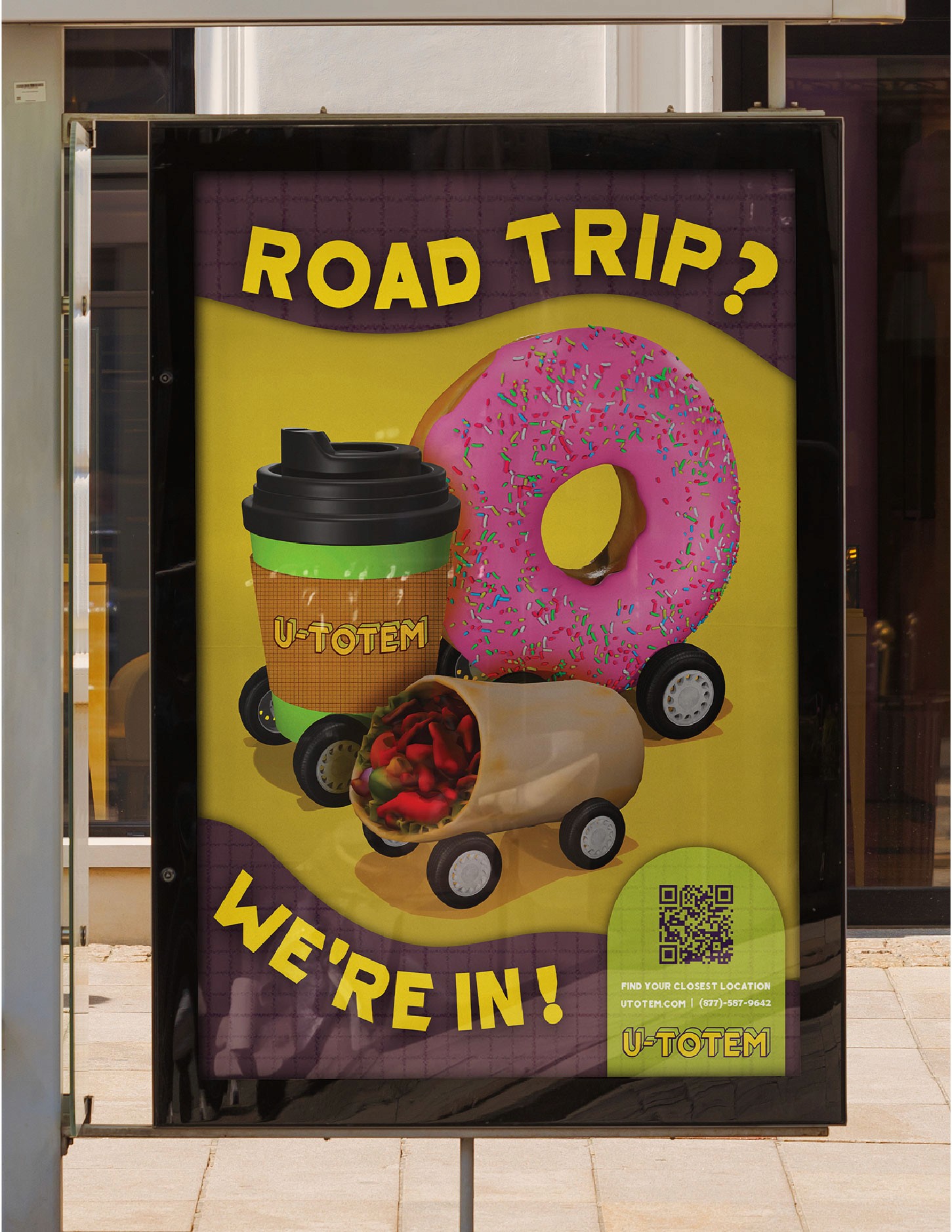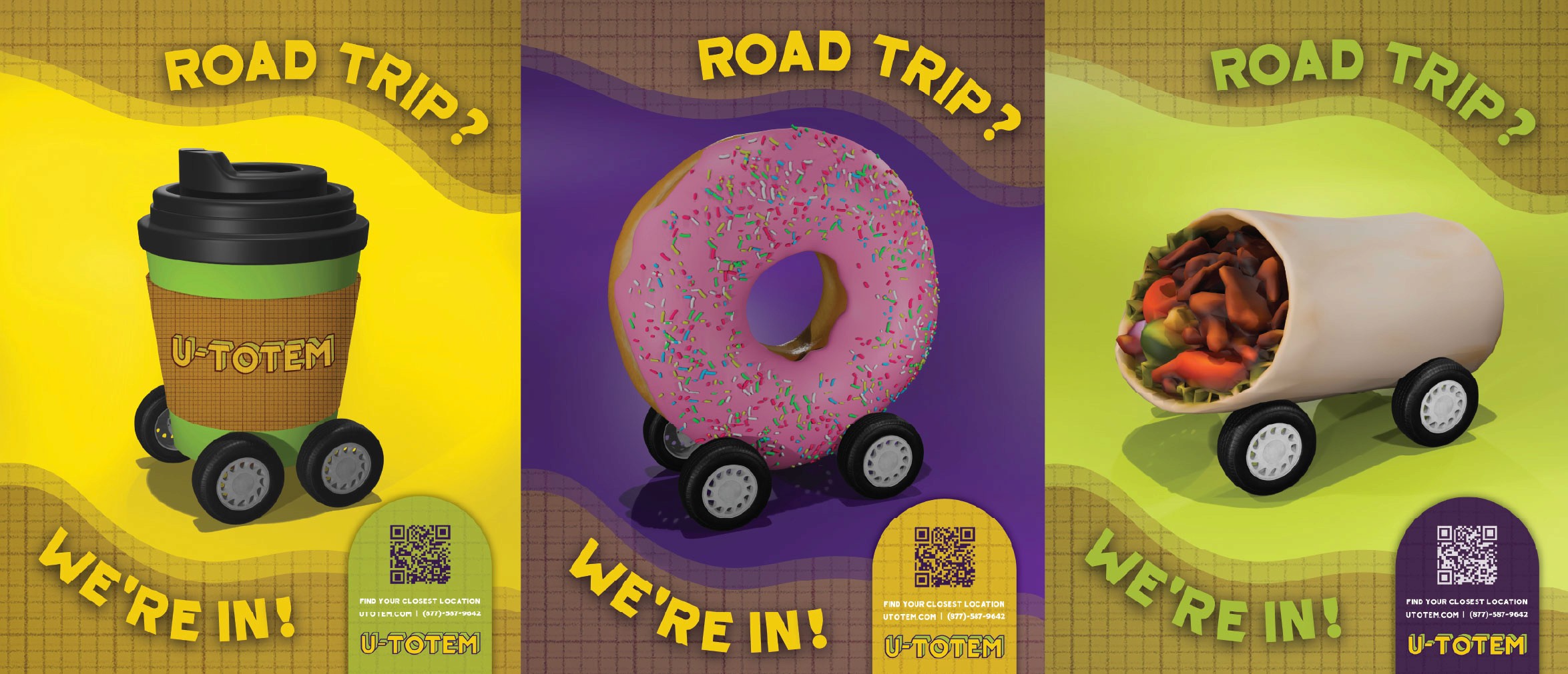 The campaign centers around the idea of the road trip, framing U-Totem as a natural and worthwhile stop along the way. Each piece highlights different moments of travel while reinforcing the brand as a dependable and appealing destination.